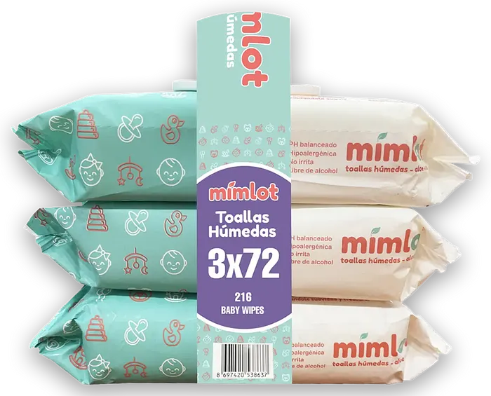 Tripack toallas húmedas Mimlot - aloe vera, 3x72, 216 baby wipes. Paquete práctico con tres paquetes de 72 pcs cada uno, enriquecidas con aloe vera para hidratar y calmar la piel del bebé, ofreciendo cuidado suave y natural en grandes cantidades.